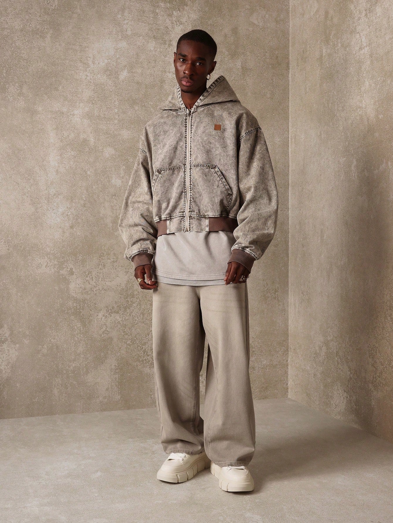 Modelagem cropped masculina, unissex, com caimento solto na cintura